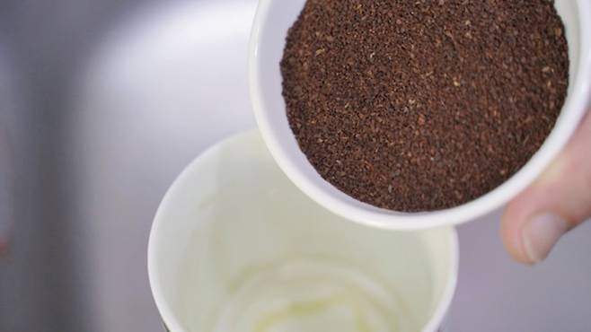건조된 커피찌꺼기를 컵 속에 적당히 부어 주세요.