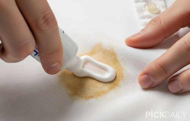 소량의 치약을 얼룩 부위에 바른 뒤 부드러운 칫솔로 가볍게 원을 그리며 문질러준다. 너무 세게 문지르면 옷감이 상할 수 있으므로 부드럽게 반복하는 것이 좋다. 이후 미지근한 물로 깨끗이 헹구고 물기를 제거하면 얼룩이 거의 사라진다.