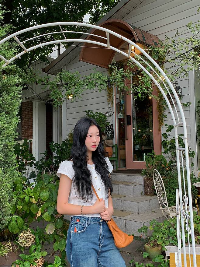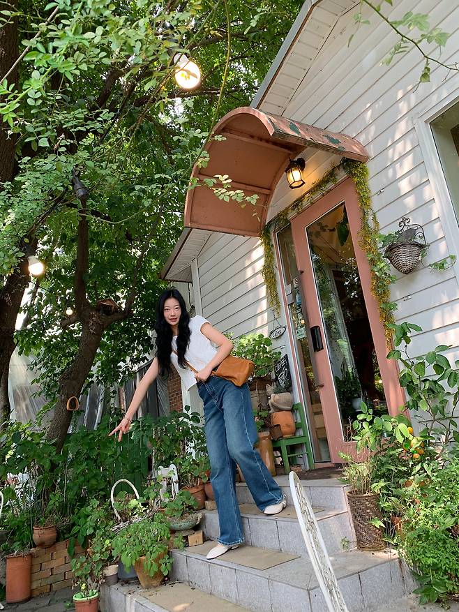 청바지 밑단 아래로 살짝 보이는 코가 둥근 플랫슈즈가 소녀스러운 감성을 완성해 주죠.