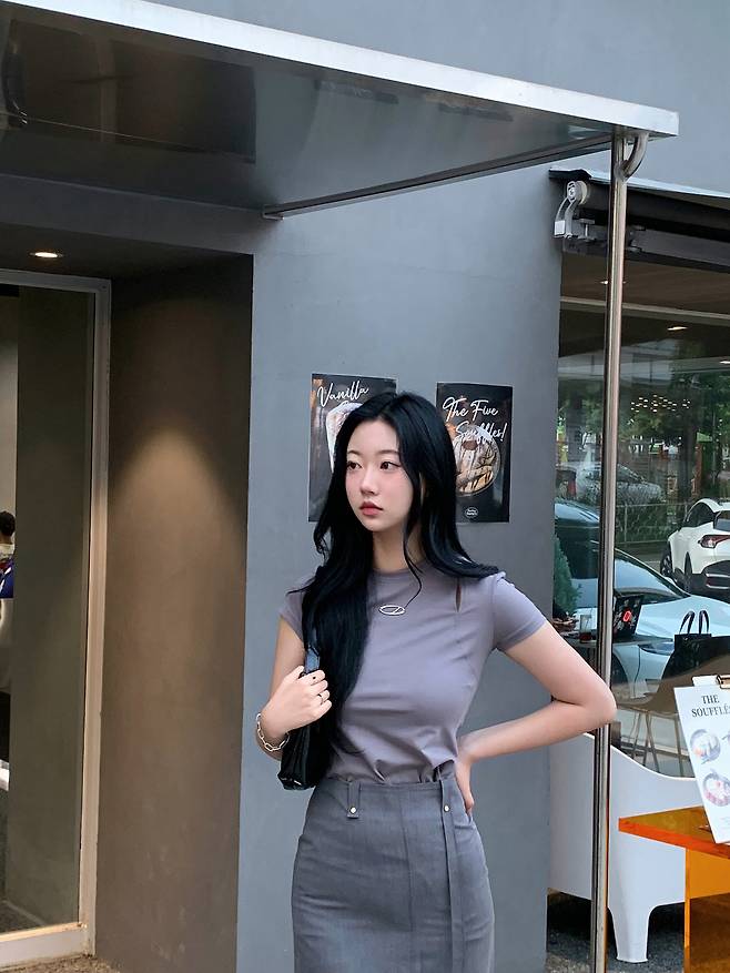 상의는 가슴 부분에 은장 로고 포인트가 들어간 짙은 회색 티셔츠를 선택해 시선을 집중시켰습니다.