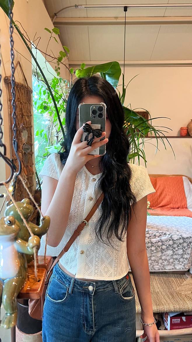깨끗한 흰색 끈 나시 위에 얇은 흰색 셔츠를 레이어드했는데요.