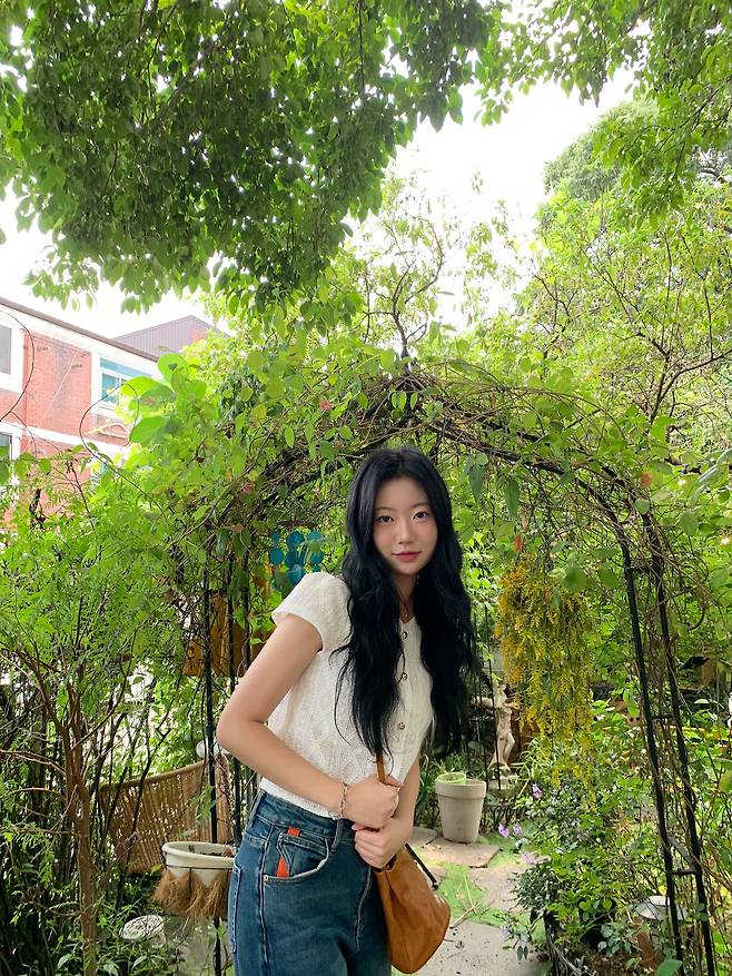 가방은 내추럴한 무드의 갈색 끈 가방을 선택해 전체적인 빈티지 감성을 연결해 주었어요.