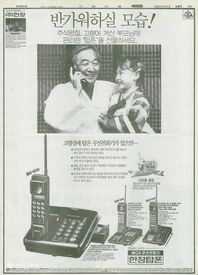 1992년 광고에는 무선전화기 선물이 눈길을 끈다. "부모님이 마당에 계셔도 전화를 놓치지 않는다"는 문구는 통신기기 보급이 본격화되던 시대상을 잘 보여준다. 추석 선물이 생활필수품에서 첨단기기로 확장되던 시기였다.