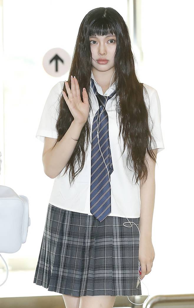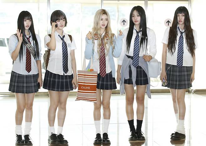 공항에 등장한 뉴진스는 스쿨룩을 맞춰입고 등장했다. 체크무늬 스커트에 반팔 셔츠를 입고 넥타이로 멋을 낸 뉴진스는 각자 개성을 드러낸 스타일로 눈길을 끌었다.