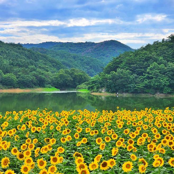 카페 내부는 외관 못지않게 정갈하고 따뜻한 분위기로 꾸며져 있다. 전통 목재의 느낌을 살린 인테리어에 커다란 통창으로 저수지와 들판이 시원하게 보인다. 실내 좌석 외에도 야외 테라스 좌석이 마련되어 있어, 날씨 좋은 날에는 꽃밭을 앞에 두고 느긋한 시간을 보낼 수 있다. 벽 쪽에는 수국과 해바라기를 테마로 한 포토존이 조성되어 있어 SNS 인증샷 명소로도 주목받는다.
