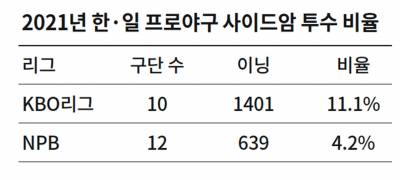 지난해 12월 NHK는 사이드암 투수를 다룬 〈사이드스로〉라는 특별 프로그램을 방영했다. 이에 따르면 2021년 NPB 1군에 등록된 사이드암 투수는 모두 27명이다. 이들은 지난해 도합 639이닝을 던졌다. 양대 리그 전체 이닝의 4.2%에 불과하다. 지난해 KBO리그 사이드암 투구 이닝 비율 11.1%의 절반에도 미치지 못한다.