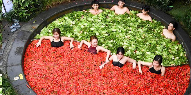 중국 저장성 항저우시에 위치한 한 호텔이 춘절을 맞이해 이색 이벤트를 선보였습니다. 이 호텔은 노천탕을 훠궈 냄비처럼 꾸미고, 다양한 채소와 과일을 온천 위에 띄웠습니다. 온천탕은 마치 훠궈 냄비를 연상시키는 모양으로, 고추, 상추, 버섯, 옥수수, 사과, 바나나, 금귤 등 여러 재료들이 노천탕에 가득 띄워져 있었습니다.