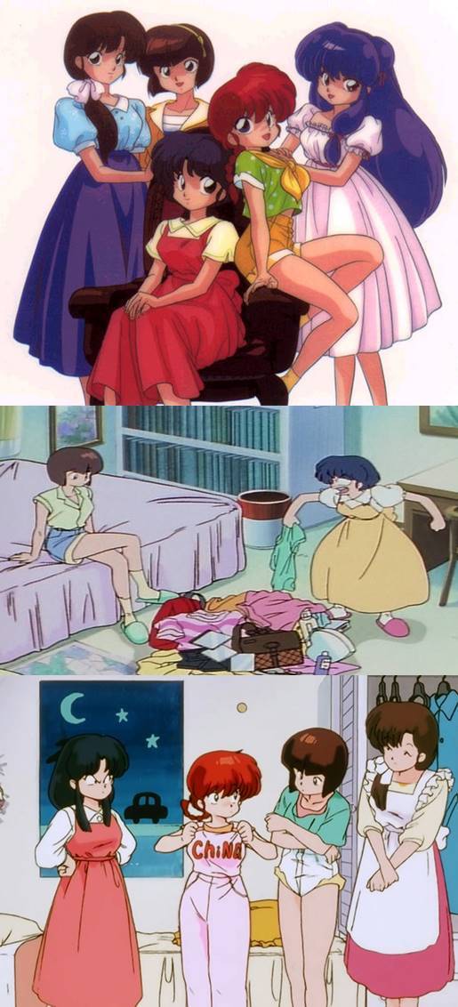 짧은 반바지와 티셔츠를 즐겨 입는 활발한 캐릭터, 롱치마와 블라우스를 입는 온화한 인물, 멜빵바지를 입는 란마까지.