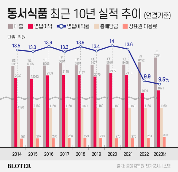 최근 10년간 실적을 보면 동서식품의 부진은 더욱 두드러진다. 연결기준 매출은 2014년 1조5057억원에서 2023년 1조7554억원으로 16.6% 늘었지만 같은 기간 영업이익은 2032억원에서 1671억원으로 17.7% 줄었다.