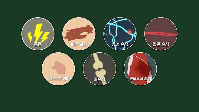 근육주사의 용량은 보통 1~3cc인데, 약물을 근육량 대비 고용량(*5cc 이상은 주입금지)으로 주사하면 약물이 한지점에 고여 압박에 의한 조직손상을 유발할 수 있습니다.