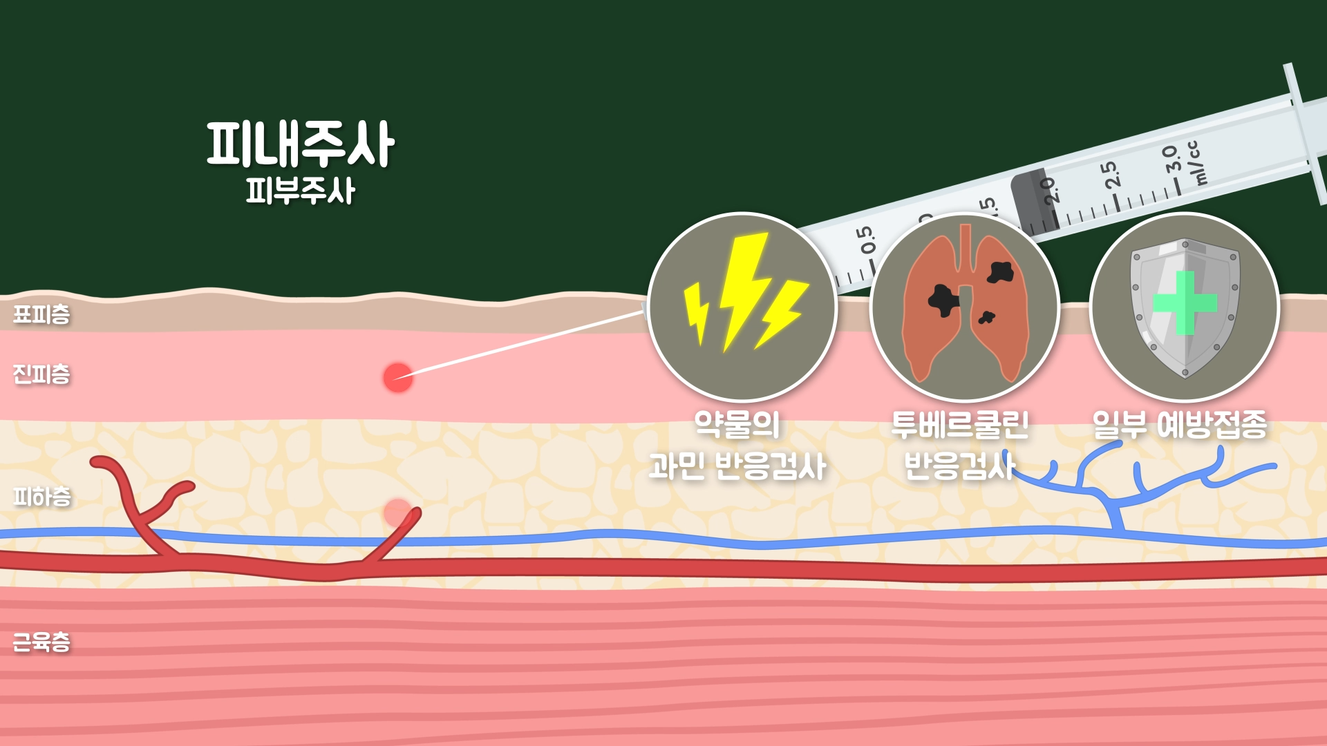 주사는 놓는 부위에 따라 피부주사(피내주사+피하주사)와 근육주사, 혈관주사로 분류할 수 있습니다. 먼저 피부주사는 표피층과 피하조직 사이에 있는 진피층에 주사하면 피내주사, 진피층 아래의 피하층(Subcutaneouse)에 주사하면 피하주사로 분류됩니다.