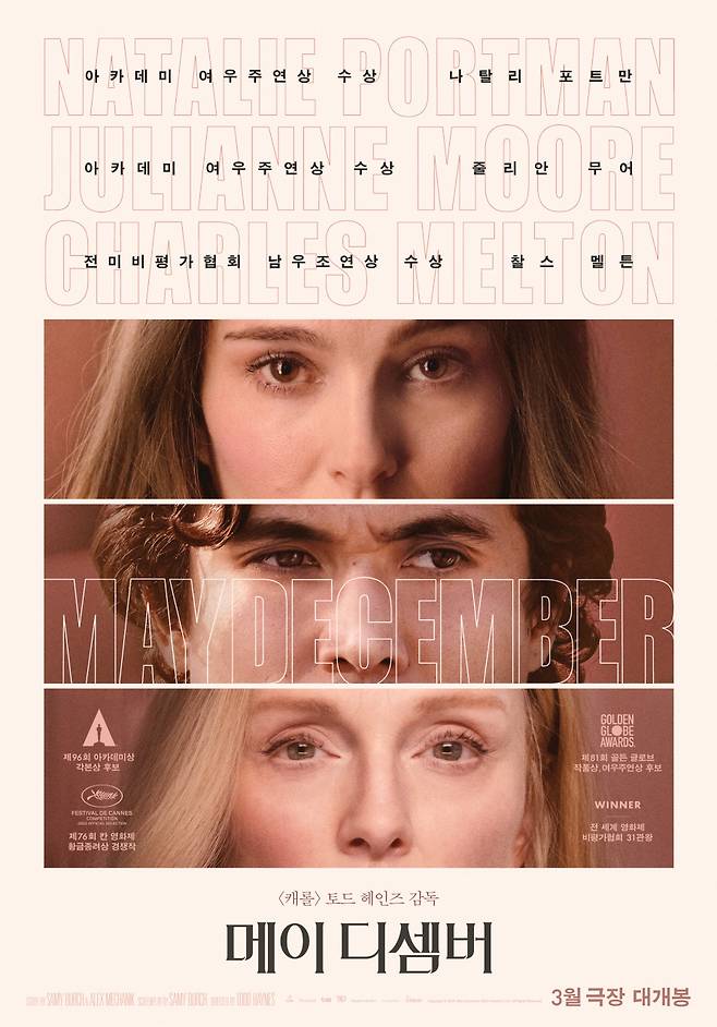 <메이 디셈버>는 충격적인 로맨스로 신문 1면을 장식했던 ‘그레이시’(줄리안 무어)와 영화에서 그를 연기하게 된 야심 넘치는 배우 ‘엘리자베스’(나탈리 포트만), 두 사람이 나누는 매혹적인 진실과 거짓, 비밀을 담은 영화.