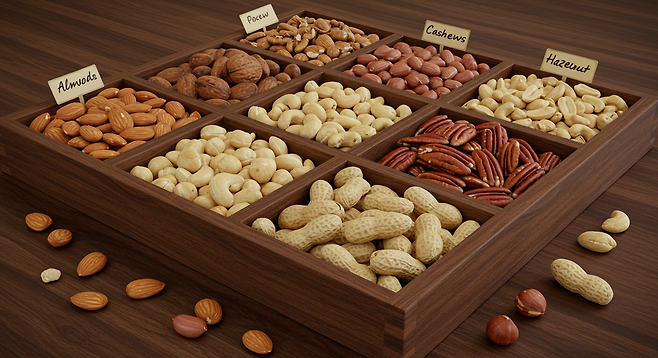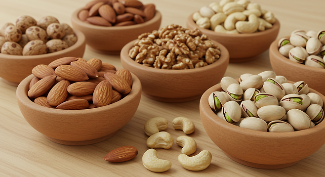 섭취 효과: 적정량의 견과류는 심혈관 질환 위험을 낮추고, 혈중 콜레스테롤 수치를 개선하는 데 도움을 줍니다. 특히 아몬드·호두의 오메가-3 지방산은 뇌 건강과 염증 완화에도 효과적입니다.