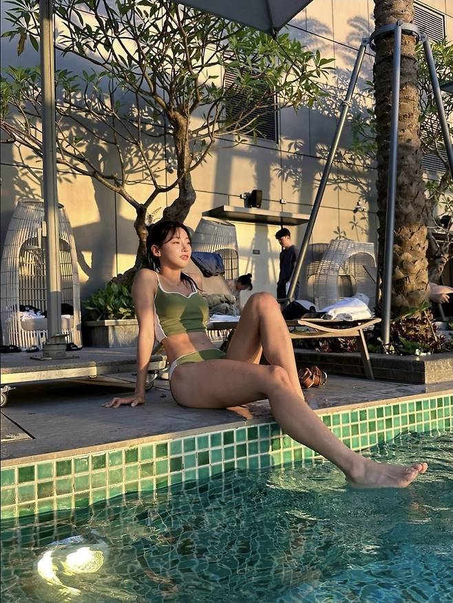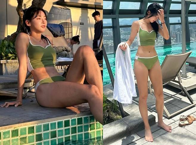 육상선수 이자 방송인 김민지가 그린 톤의 투피스 스윔웨어로 탄탄한 보디라인을 드러내며 시선을 사로잡았습니다.
