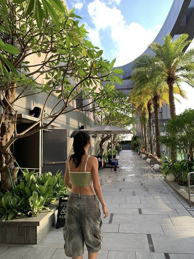 복근과 허리 라인을 완전히 드러낸 크롭 기장 상의와 로우라이즈 하의로 각선미와 복근 라인을 돋보이게 했으며, 햇살 아래 건강미 넘치는 태닝 피부가 더욱 빛을 발했습니다.