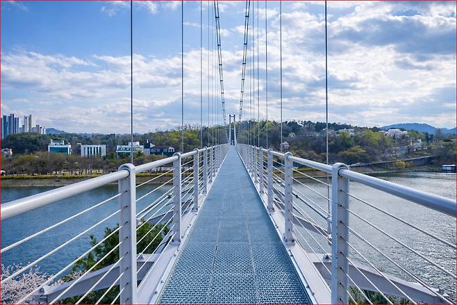 파노라마 조망: 다리 위에서는 만개한 공지천 벚꽃길은 물론 춘천대교, 레고랜드까지 조망할 수 있어 춘천의 변화하는 모습을 기록하기에 최적의 장소입니다.