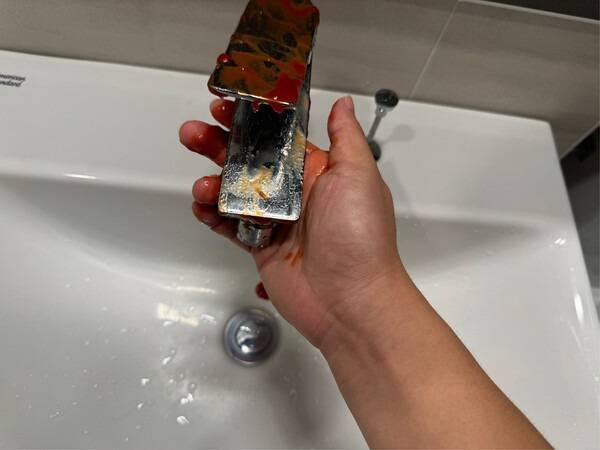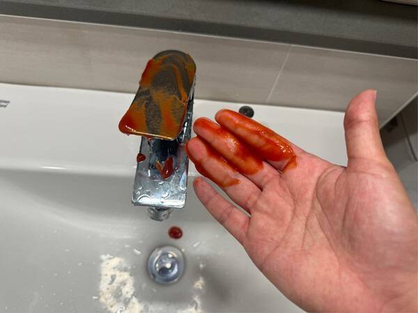 케찹 발라 놓은 표면은 충분히 헹구고, 남은 케찹 성분이 금속에 오래 남지 않도록 합니다.
