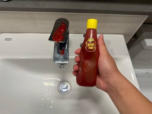 케찹을 수전, 샤워기, 싱크대 손잡이 등 금속 부분에 바른 후, 칫솔과 솔로 살짝 문지르면 묵은 물때·녹이 손쉽게 제거됩니다.