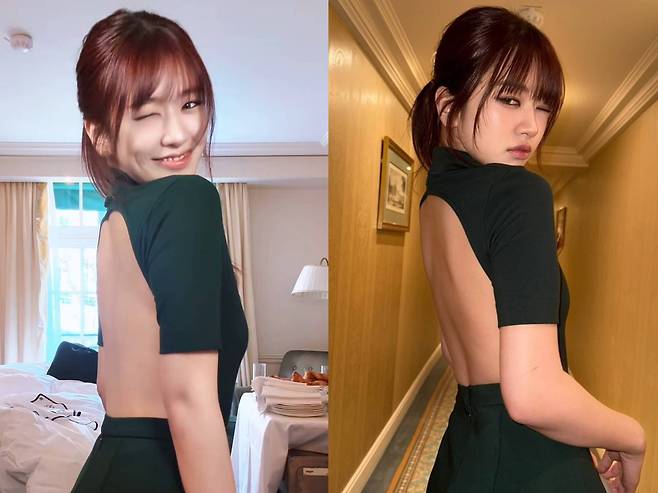 안유진은 깊은 컬러감의 백리스 드레스를 입고, 특유의 도회적이고 시크한 아우라를 발산하며 시선을 사로잡았습니다.