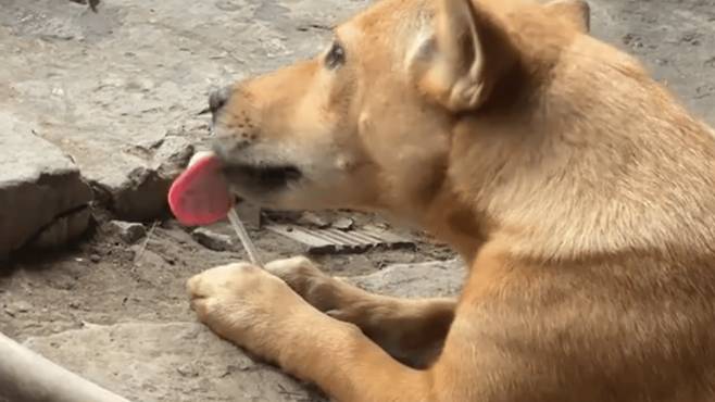화창한 날에 거리를 걷던 한 네티즌은 땅에 엎드려 있는 강아지를 발견했습니다. 처음에는 그냥 쉬는 줄 알았는데, 가까이 다가가 보니 강아지가 땅에 꽂혀 있는 막대사탕을 먹고 있는 모습이었습니다!