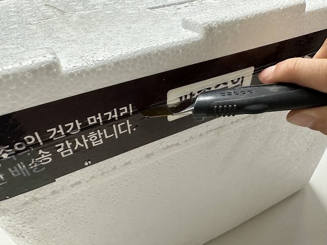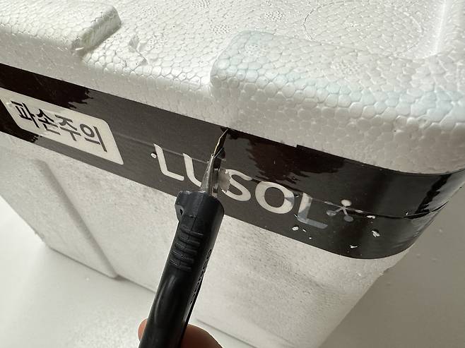 택배는 보통 테이프 방향으로 가로로 자르는데요 이러면 아이스박스도 같이 자르게 돼요.