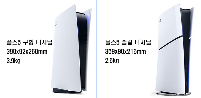 가장 큰 변화는 부피가 줄었다는 것. 디지털 모델을 기준으로 플레이스테이션 5 구형은 390x92x260mm였다. 플레이스테이션 5 슬림은 약 30%의 부피가 줄어든 358x80x216mm다. 조금이라도 공간을 넓게 사용하고 싶은 게이머라면 슬림이 나은 선택일 수 있다.
