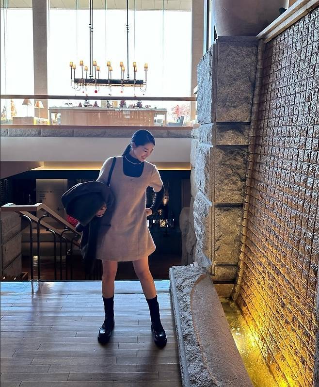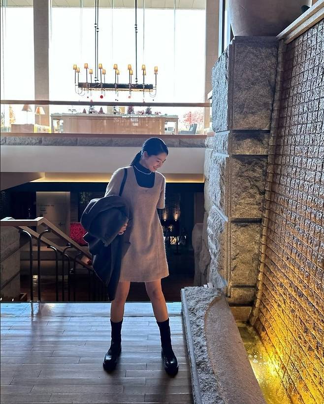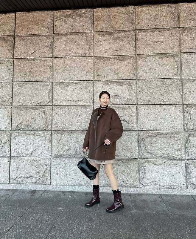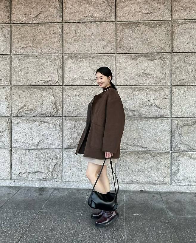 무릎 위로 올라오는 밤색 미니원피스와 대비되는 오버핏 브라운 코트는 스타일리시한 감각을 보여주었습니다.