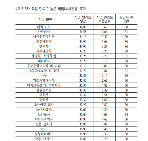 한국고용정보원에서 발표된 2018년 직업정보에 따르면, 직업 만족도가 높은 직업 1위는 대학교수, 2위는 안과의사, 3위는 이비인후과의사, 4위는 정신과의사, 5위는 한의사 , 6위는 피부과의사, 7위는 행정부고위공무원, 8위는 내과의사, 9위는 중고등학교교장 및 교감, 10위는 초등학교교장 및 교감입니다.