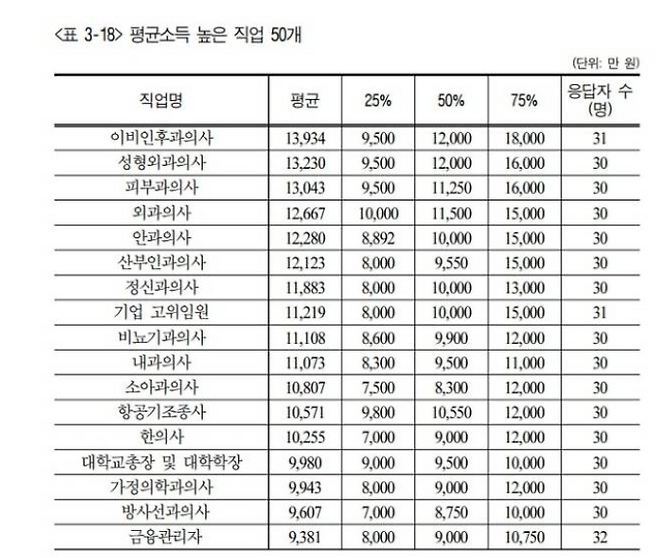 한국고용정보원이 올해 초 발표한 2020 직업정보 연구보고서에 따르면 소득이 가장 높은 직업은 이비인후과의사였습니다. 1위는 이비인후과의사 1억3932만원, 2위는 성형외과 의사로 1억3230만원,3위는 피부과 의사로 1억3043만원, 4위는 외과 의사로 1억2667만원, 5위는 안과 의사로 1억2280만원, 6위는 산부인과 의사 1억2123만원, 7위 정신과 의사 1억1883만원, 8위 기업 고위임원 1억1219만원입니다.