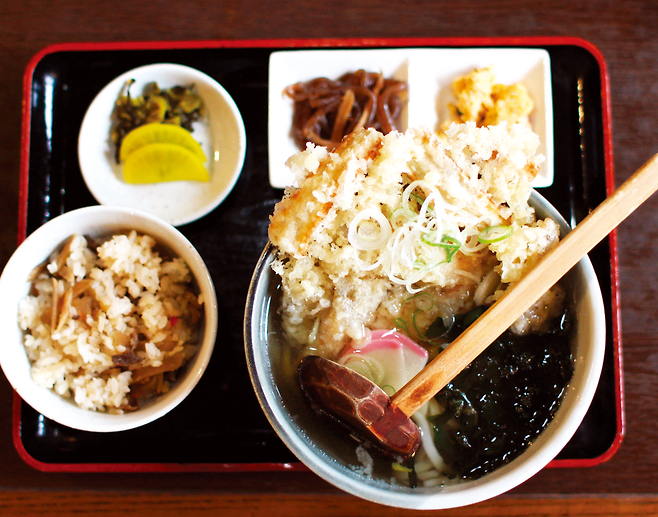대표 메뉴는 우엉튀김 우동인 고보텐 우동은비주얼부터 심상치 않다. 우동에 커다란 우엉튀김을 그릇에 넘칠 정도로 담아 내온다. 우엉튀김은 튀김옷이 얇고 바삭한데, 우동 국물에 살짝 풀어지면 더 맛있다. 우엉밥과 오늘의 반찬, 츠게모노로 구성된 고보텐 우동 세트를 추천한다.