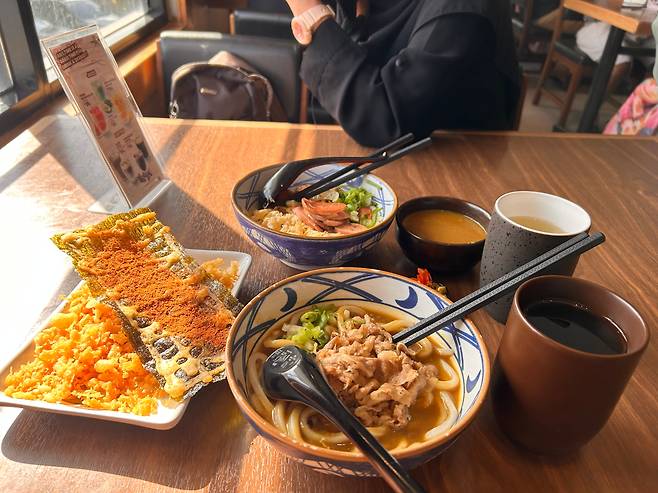 재료를 그때그때 만들기 때문에 언제든 원하는 메뉴를 먹을 수 있는 점 또한 장점. 토핑은 두 가지를 함께 주문할 수 있는데, 에비카키아게(새우튀김), 고보(우엉), 니쿠(고기) 등이 인기다. 우동 외에도이나리( 유부초밥)나 볶음밥을 곁들이면 훨씬 맛있다. 한국어 메뉴판이 있다.