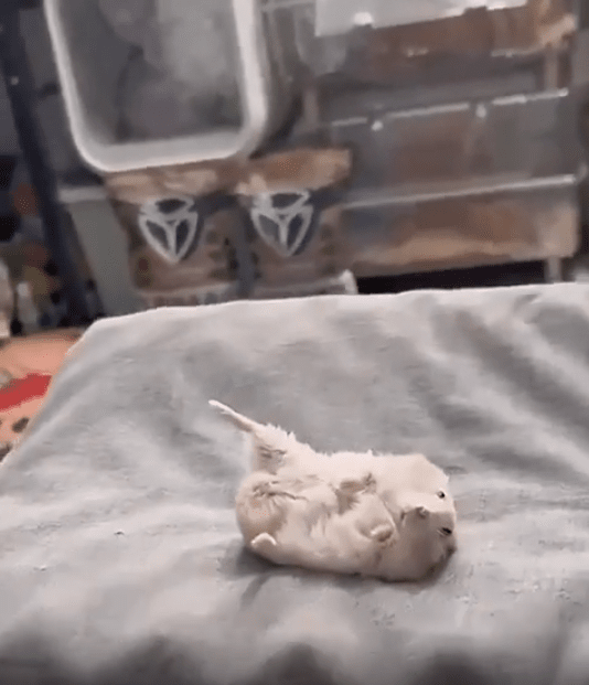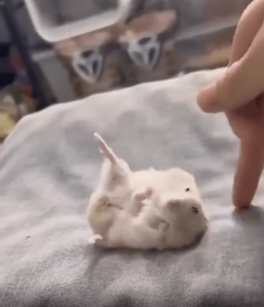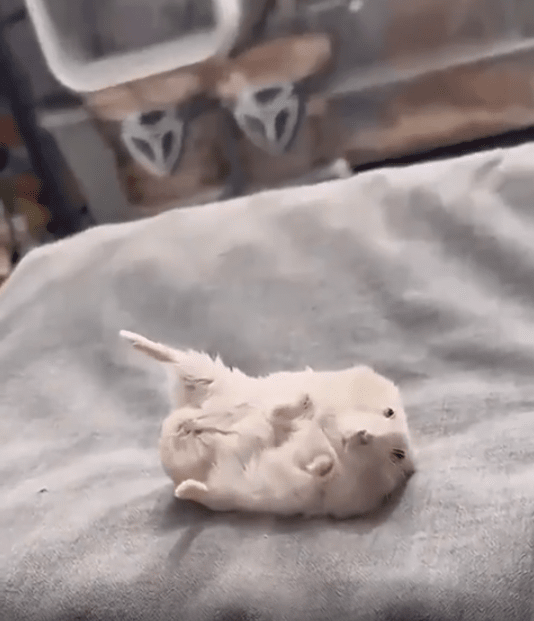 바닥에 등을 대고 누워 있는 조그만 햄스터 한 마리가 보입니다. 그런데 이 녀석, 자세가 심상치 않습니다. 자신도 다리를 다친 것처럼 한쪽 뒷다리를 위로 들고 그대로 얼어붙은 듯 누워있는 모습입니다. 작고 동그란 몸은 마치 배를 깔고 잠든 듯하지만, 높이 든 다리 하나가 모든 걸 설명하고 있죠. 마치 "나도 아픈 거야" 혹은 "같이 쉬자"는 듯한 표정. 그 시선에는 장난기 반, 걱정 반, 어쩌면 순수한 모방의 마음이 담겨 있는 듯합니다.