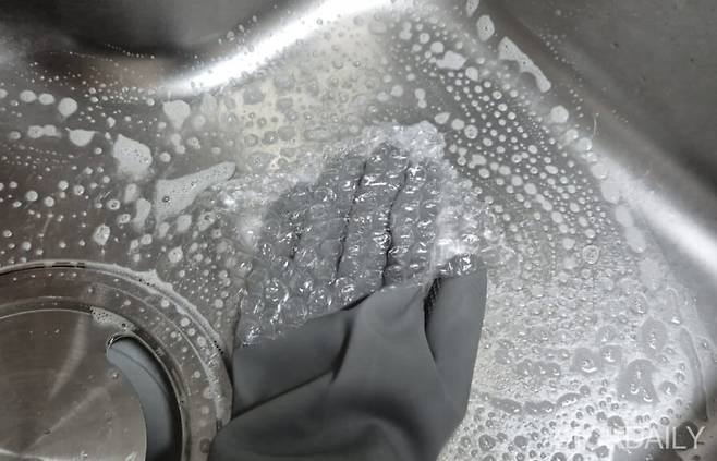 설거지를 해야 하는데 수세미가 없을 때 뽁뽁이를 활용해보자. 적당한 크기로 잘라 세제와 함께 사용하면 기름때와 음식물 찌꺼기를 효과적으로 제거할 수 있다. 표면의 공기층이 거품을 내는 데 도움을 주며, 사용 후 바로 버릴 수 있어 위생적으로도 좋다. 특히 기름기가 가득한 그릇의 애벌 수세미로 사용하면 유용하다.