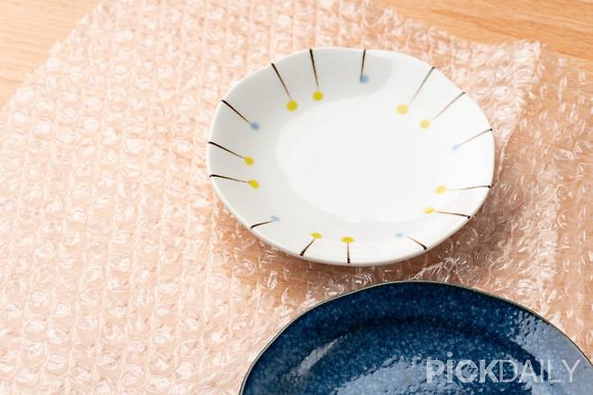 접시나 그릇을 겹쳐 보관할 때 사이사이에 뽁뽁이를 끼워주면 스크래치를 방지할 수 있다. 특히 도자기(세라믹)나 유리 그릇을 안전하게 보관하는 데 유용하며, 이동할 때 충격을 흡수해 깨지는 것을 예방하는 효과도 있다.