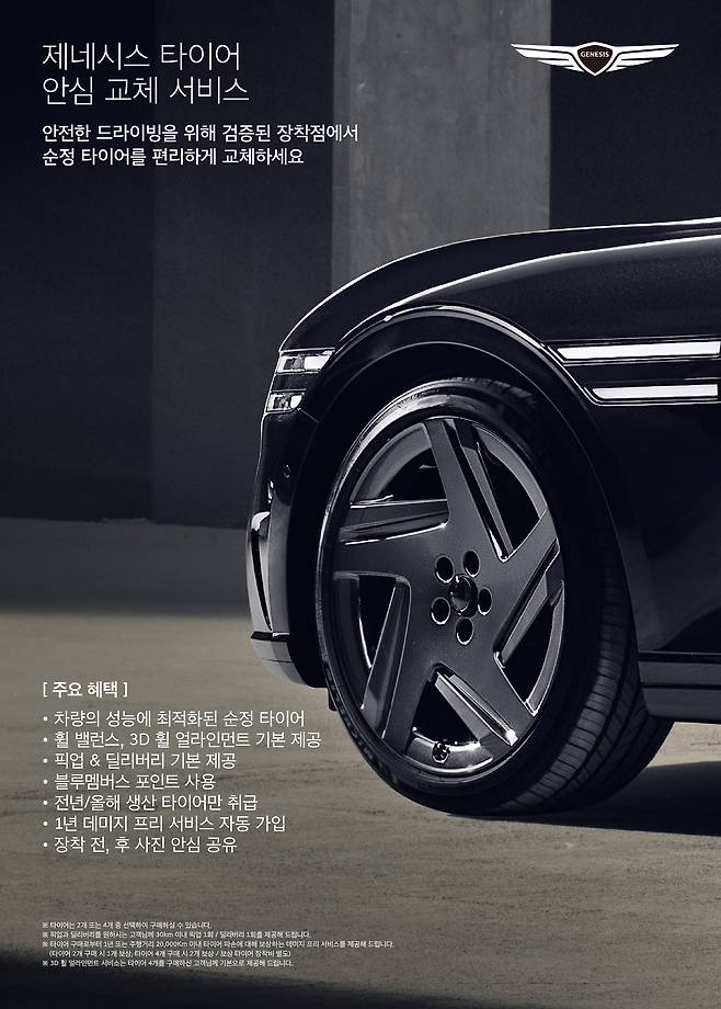 `타이어 안심 교체 서비스`는 지난 4일부터 제네시스 부티크(GENESIS BOUTIQUE) 홈페이지에서 해당 상품을 구매해 이용할 수 있다. 제네시스는 서비스 출시를 기념해 타이어 4본 구매 고객 선착순 300명에게 제네시스 플로팅 휠 캡을 제공한다.