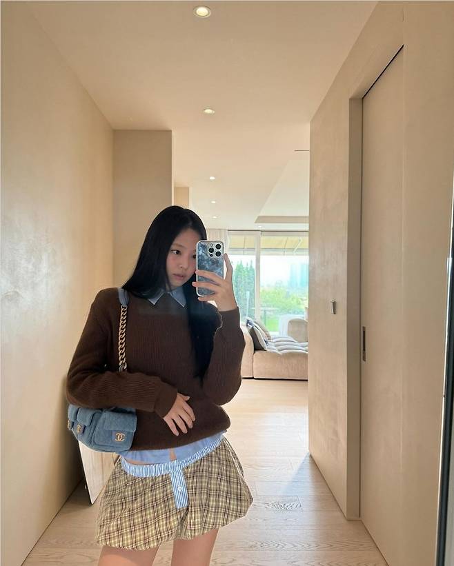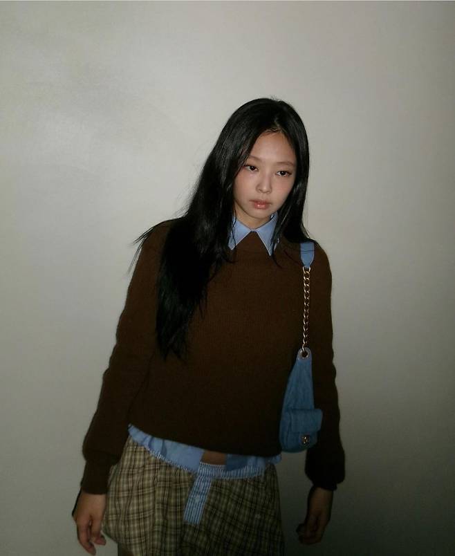 제니는 브라운 컬러의 니트 스웨터에 클래식한 셔츠를 레이어드해 깔끔하면서도 따뜻한 분위기를 연출했습니다.