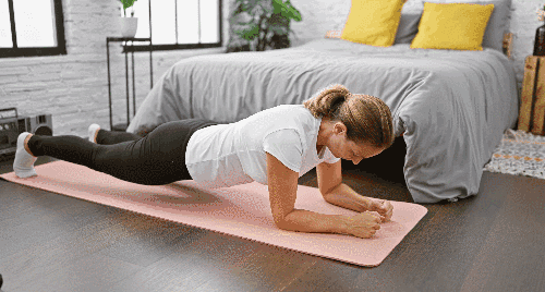 매트에 팔꿈치를 대고 엎드려 팔꿈치 플랭크 자세를 취합니다. 오른팔을 펴 손바닥을 바닥에 대고 상체를 들어 올린 뒤, 왼팔도 펴서 기본 플랭크 자세를 만듭니다. 이후 오른팔을 구부려 팔꿈치를 바닥에 대고 상체를 낮추고, 왼팔도 구부려 다시 팔꿈치 플랭크 자세로 돌아옵니다.
