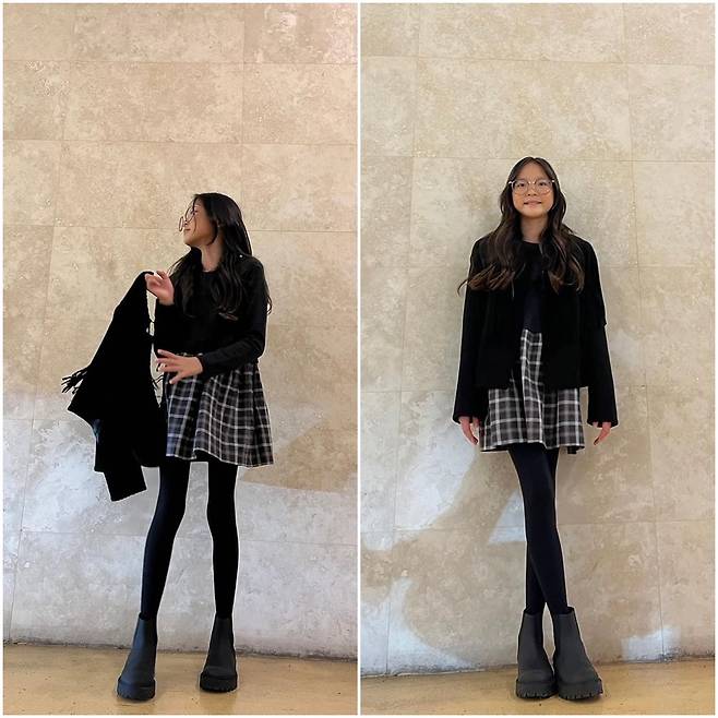 체크무늬 스커트와 청키 부츠 조합은