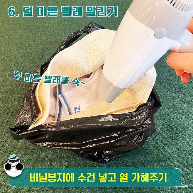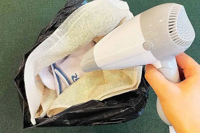 방법은 무척 간단해요. 덜 마른 양말의 경우 비닐봉지 안에 수건을 넣고 그 안에 젖은 양말을 넣은 후 헤어 드라이기로 따뜻한 바람을 쐬어주세요. 그러면 비닐봉지 내부에서 건조기와 비슷한 효과가 생기며 덜 마른 양말을 빠르게 건조할 수 있답니다.
