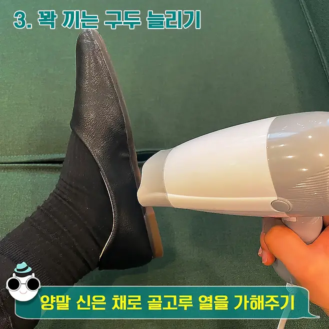 새 구두를 샀는데 발이 너무 꽉 끼어서 뒤꿈치도 까지고 발도 아팠던 경험 다들 있으시죠? 이럴 때는 양말까지 착용한 상태로 새 신발을 신은 후 헤어 드라이기로 3분 정도 따뜻한 바람을 쐬어주면 돼요.