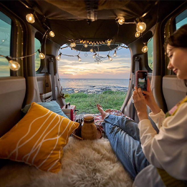 내부에선 블랙-베이지 타탄 패턴의 방수 원단을 특징으로 하는 조이 전용 인테리어를 볼 수 있다. 2열은 풀 플랫이 가능해 캠핑 등 야외 활동 시 휴식을 취하고 전망을 즐길 수 있는 공간을 만들어낸다.