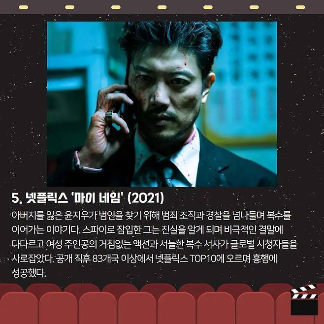 🔪 《마이 네임》아버지를 잃은 윤지우가 범죄 조직과 경찰 사이를 넘나드는 복수극. 여성 주인공의 거침없는 액션과 비극적 결말은 글로벌 시청자를 사로잡으며 83개국 이상에서 넷플릭스 TOP10에 올랐습니다.