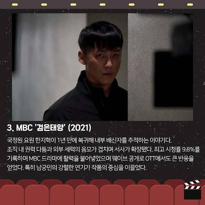 🕵️ 《검은태양》국정원 요원 한지혁이 내부 배신자를 추적하는 이야기. 조직 내 권력 다툼과 음모가 겹쳐진 서사와 남궁민의 강렬한 연기로 최고 시청률 9.8%를 기록하며 화제를 모았습니다.