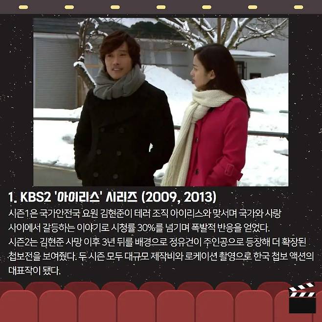 💥 《아이리스》 시리즈국가안전국 요원 김현준과 테러 조직 아이리스의 대립. 대규모 제작비와 로케이션 촬영으로 한국 첩보 액션의 대표작이 되었고, 시즌1은 시청률 30%를 넘으며 폭발적 반응을 얻었습니다.