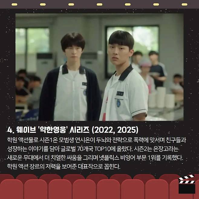📚 《약한영웅》 시리즈학원 액션의 저력을 보여준 작품! 시즌1은 글로벌 70개국 TOP10에, 시즌2는 넷플릭스 비영어 부문 1위를 기록하며 큰 반향을 일으켰습니다.