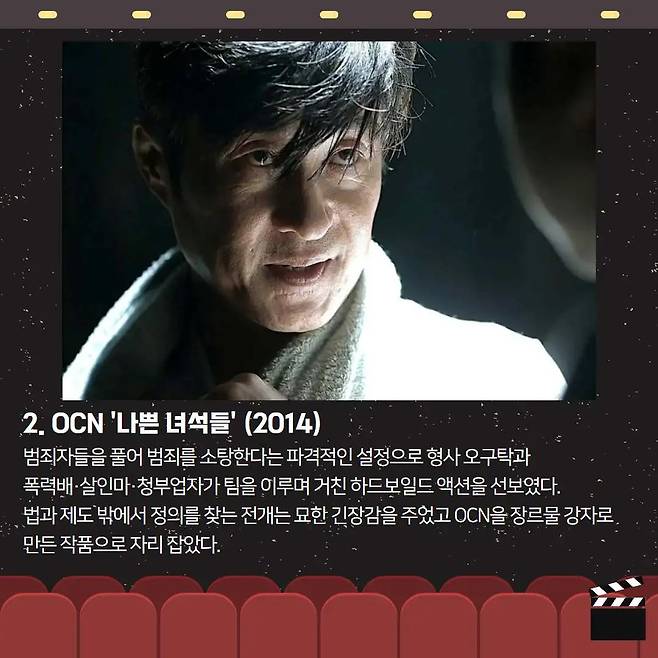 👊 《나쁜 녀석들》범죄자들을 풀어 범죄를 소탕한다는 파격 설정! 형사와 범죄자들의 팀플레이로 거친 하드보일드 액션을 보여주며 OCN을 장르물 강자로 올려놓았습니다.