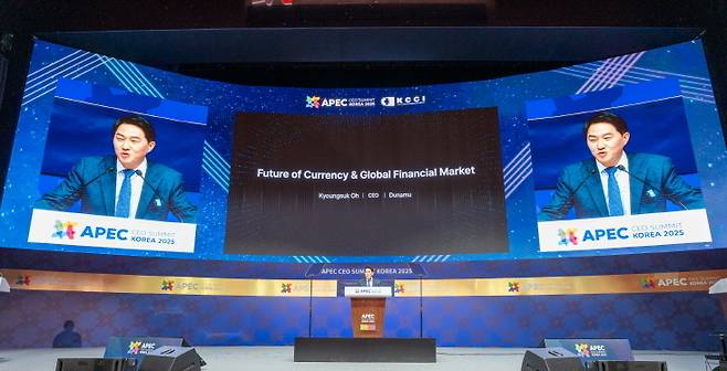 오경석 두나무 대표가 29일 경주예술의전당 화랑홀에서 열린 'APEC CEO 서밋 코리아 2025'에서 '통화와 글로벌 금융시장의 미래'를 주제로 기조연설을 하고 있다. (두나무 제공=연합뉴스)]