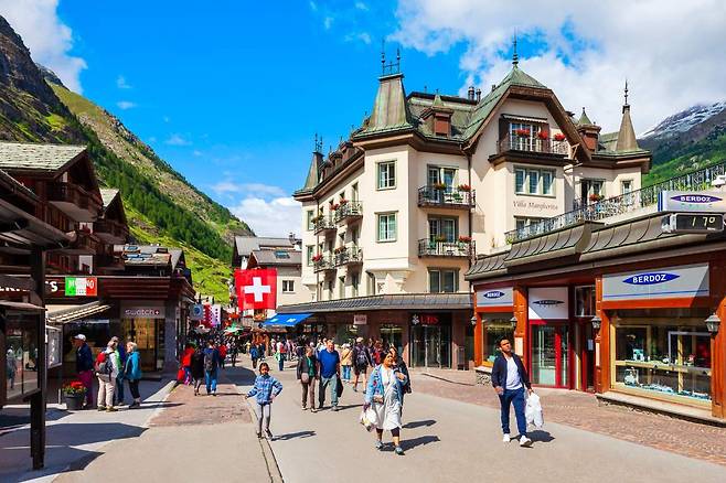 마지막 목적지는 바로 마터호른의 도시, 체르마트입니다. 이 도시는 환경 보호를 위해 내연기관 자동차의 진입을 엄격히 금지할 정도로 청정한 도시인데요. 그래서인지 마을 전체가 훨씬 더 고요하고 맑은 공기를 자랑하죠.