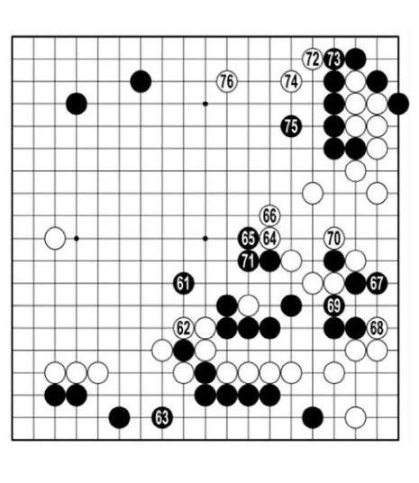 인공지능 카타고가 본 백이 이길 확률이 90%를 넘기 시작했다. 백62로 따니 시끄러운 일이 일어나지 않는다. <참고 1도> 백1에 먼저 뻗으면 흑6으로 나와 몸싸움이 벌어진다.