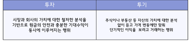 벤저민 그레이엄에 따르면 철저한 분석을 기반으로 원금의 안정성과 적정한 수익을 추구하는 행위를 투자(investment)라고 하며, 반대로 자신이 투자하려는 기업이 무엇을 하는지 알아보지도 않고, 또는 재무적으로 얼마나 튼튼한지 확인해 보거나 그 회사의 CEO가 어떤 사람인지를 확인하지도 않고 무턱대고 그 회사에 돈을 투입하면 그것이 바로 투기(speculation)라고 하였습니다.